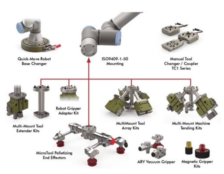 MultiMount Machine Tending: két megfogó vagy két szerszám befogadására alkalmas – főleg CNC megmunkálóközpontokban történő munkadarabcsere-alkalmazásokhoz ajánlják. Blank, ISO-9409-50 és DirectConnect rögzítőlemezekkel is rendelkezik.