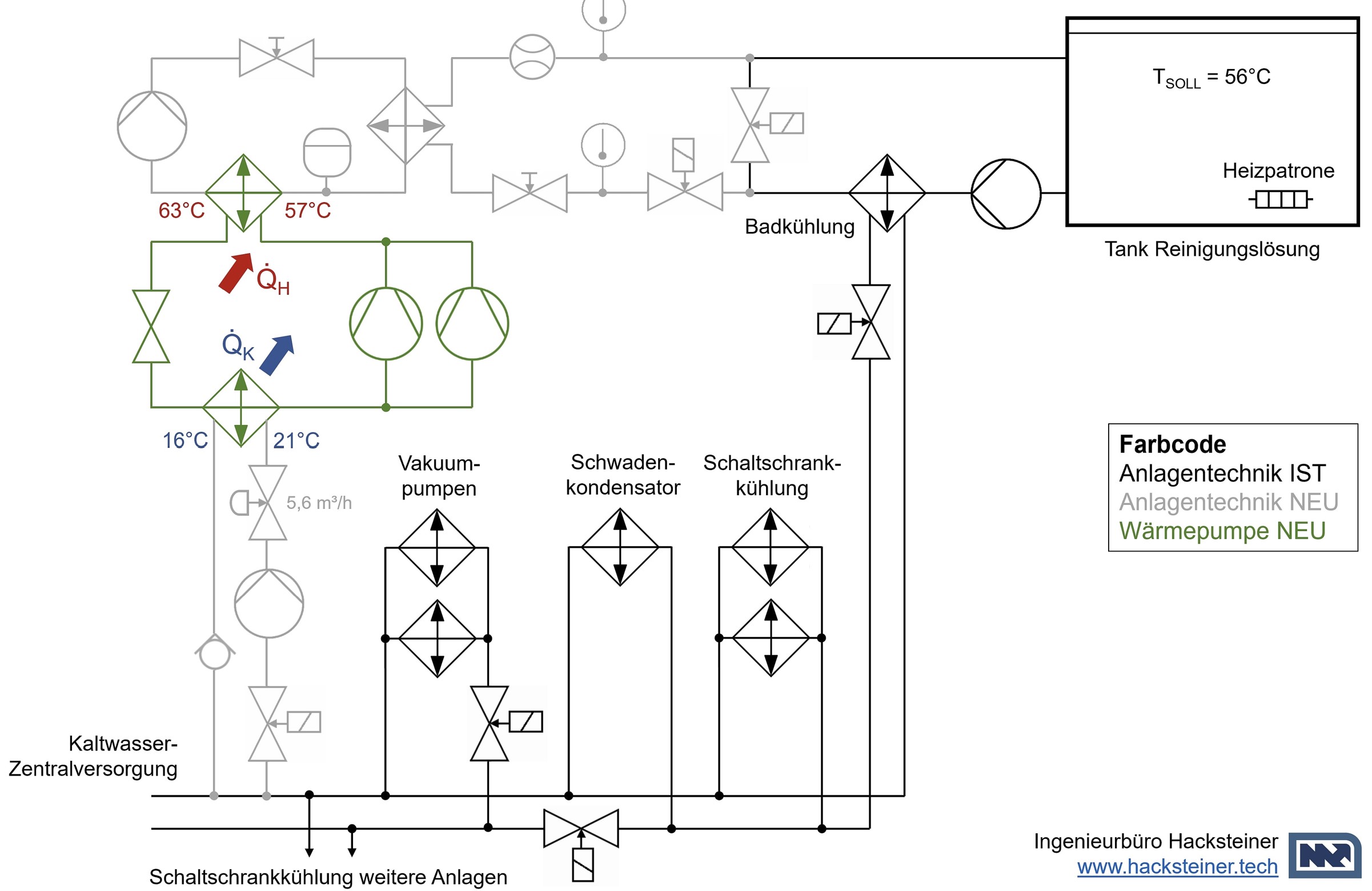 A megoldás pontosan igazodik a steyri BMW helyzetéhez: az átvezető rendszer tetején egy 2000 literes tartály található a tiszta víz számára, amelyet 56 °C-on vezetnek be a tisztítási folyamatba. Az ehhez szükséges elektromos fűtési rendszer 39 kW teljesítményű volt. A vákuumszivattyúk és a kapcsolószekrény hűtése hidegvizes körrel történik. A hűtővíz előremenő hőmérséklete 16 °C, a visszatérőben 22 °C-os. Ez a „meleg víz” energiaforrásként szolgál. A hőszivattyúba táplálják (energiafogyasztás 11,2 kW), és ott felfűtik 65 °C-ig. A hő egy lemezes hőcserélőn keresztül kerül a tisztítórendszer melegvíz-ellátásába. A felmelegített technológiai vizet egy új keringgető szivattyú segítségével (1,2 kW teljesítményfelvétel) szivattyúzzák a tisztítórendszer melegvíz tartályába, míg a 16 °C-ra hűtött vizet egy második új keringgető szivattyún keresztül juttatják vissza a hidegvíz körbe. 1,2 kW. Ezzel az átgondolt megoldással az energiaigény 39 kW-ról 13,6 kW-ra csökken. Az 5760 órás meghatározott éves termelési idő mellett ez több mint 146 MWh-t tesz ki. Emellett további mintegy 23 MWh megtakarítás érhető el a hidegvíz termelésben, mivel a hűtővizet csak alacsonyabb visszatérő hőmérsékletről kell az előremenő hőmérsékletre hozni.