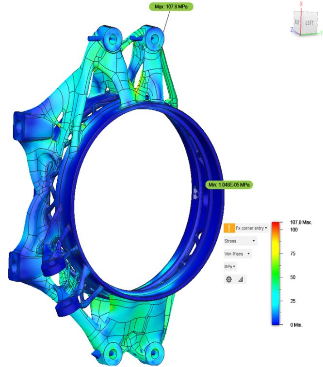 A fenti képen egy kanyarbejárat során fellépő erők okozta feszültségeloszlás látható, amely egy utólagos végeselemes szimuláció eredménye. Ellenőrzésképpen az összes terhelési esetre külön szimuláció készült, ahol az előre eltervezett feszültségcsúcsok, illetve a homogén feszültségeloszlás árulkodott a generatív módszer sikerességéről.
