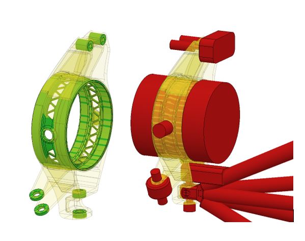 A fenti képeken áttetsző sárga színnel látható az egyik korábbi csonkállvány, zölddel a definiált védett geometriák (bekötési pontok, csapágyhelyek stb.), illetve pirossal ugyanezen alkatrész akadálygeometriái (kerékagy, lengőkarok stb.).